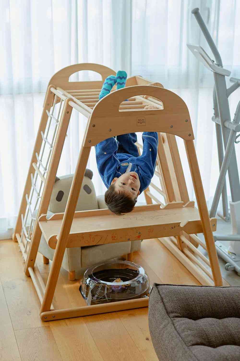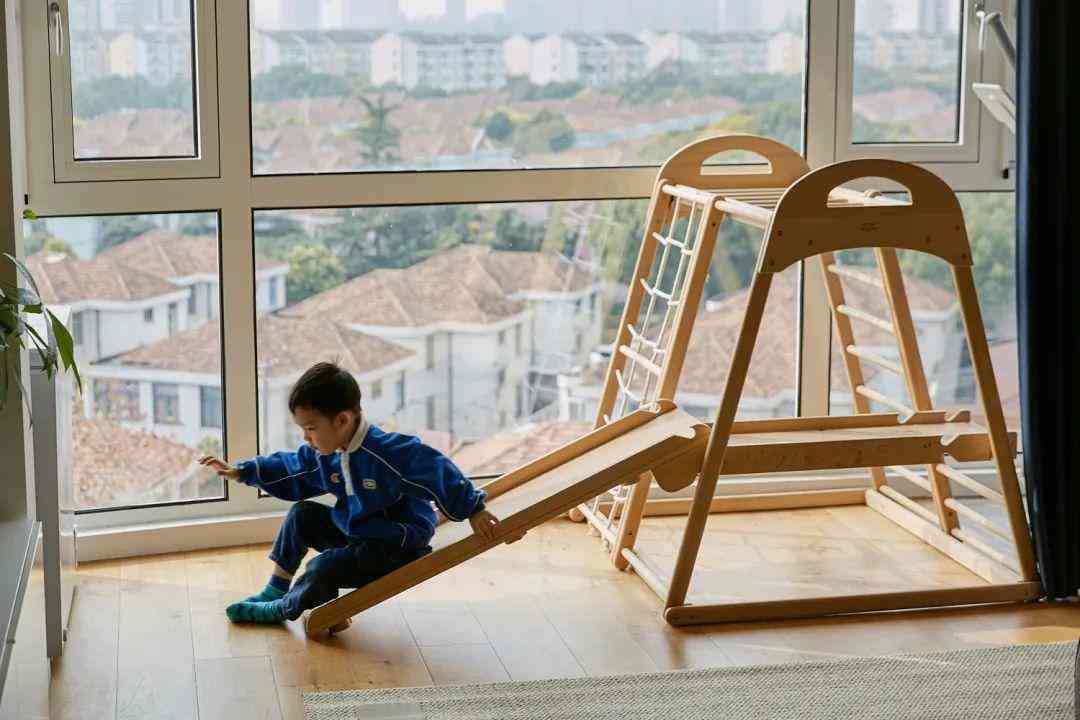 拆除了客厅和阳台之间的移门,空间更为通透明亮,阳台摆放滑梯和攀爬架组合,成了小朋友的乐园。