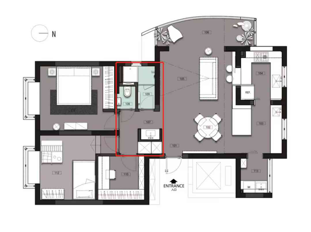 • 洗手台外移,卫生间做3分离式设计,并利用背面空间做玄关储物柜;