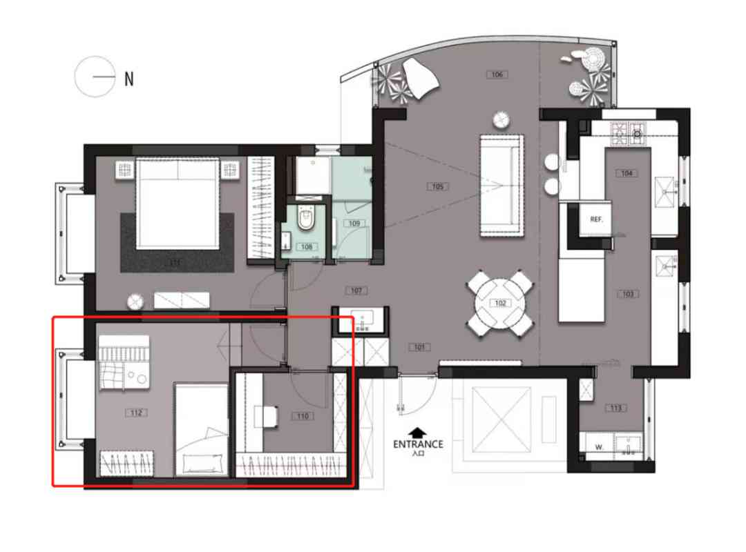 • 衣帽间扩大,兼有储物+书房的双重功能。