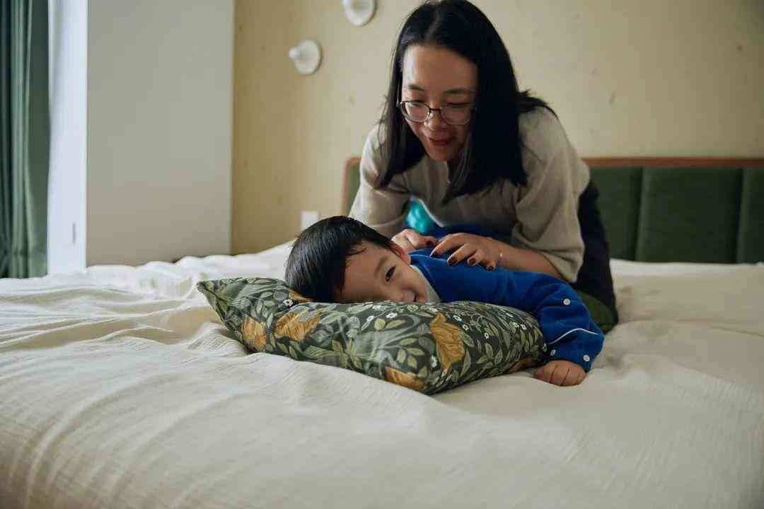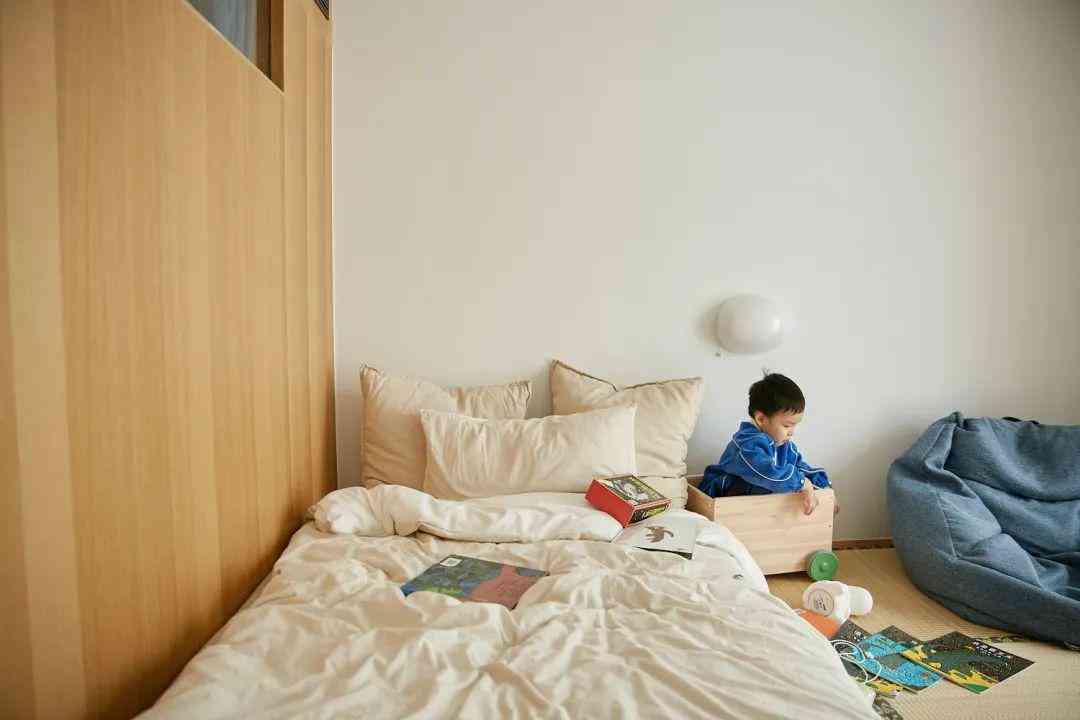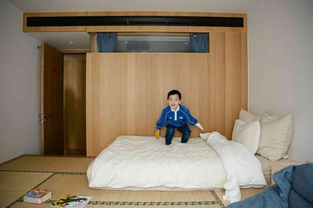 房间里没有床,直接在草垫子上铺床垫,大饼小朋友可以无阻隔地跑来跑去,低高差也避免了掉下床的危险。