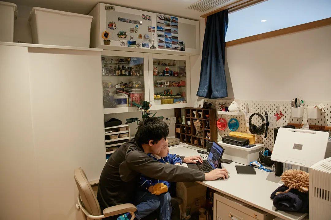 木饰面板后面是爸爸居家办公的书房,用一扇条形腰窗提供采光,避免逼仄感。