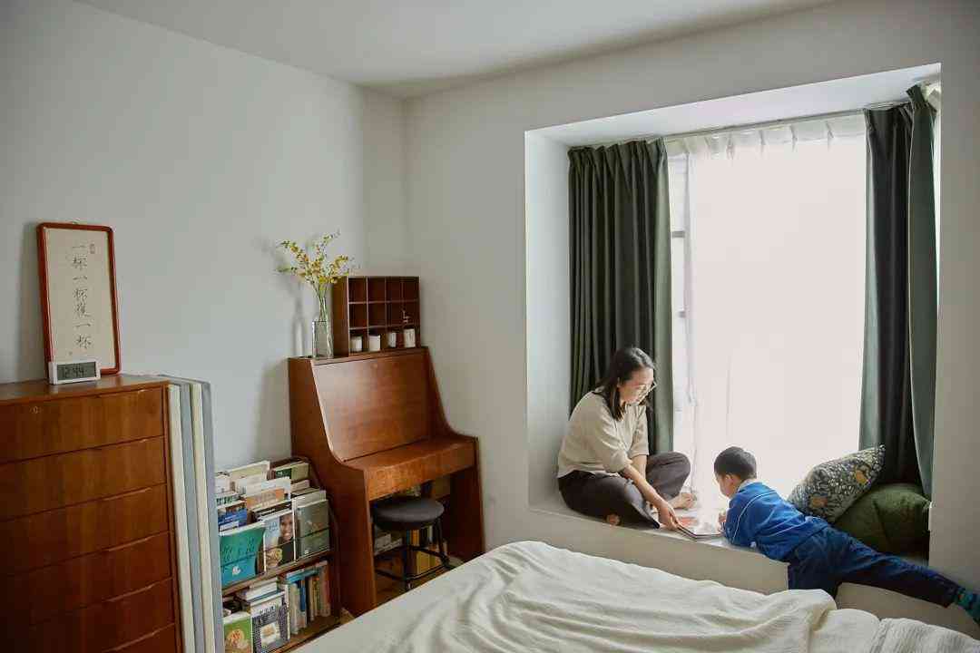 斗柜和梳妆台之间有一个小书架,放着男女主的床头书,阳光充裕的飘窗台也是看书、读绘本的好地方。