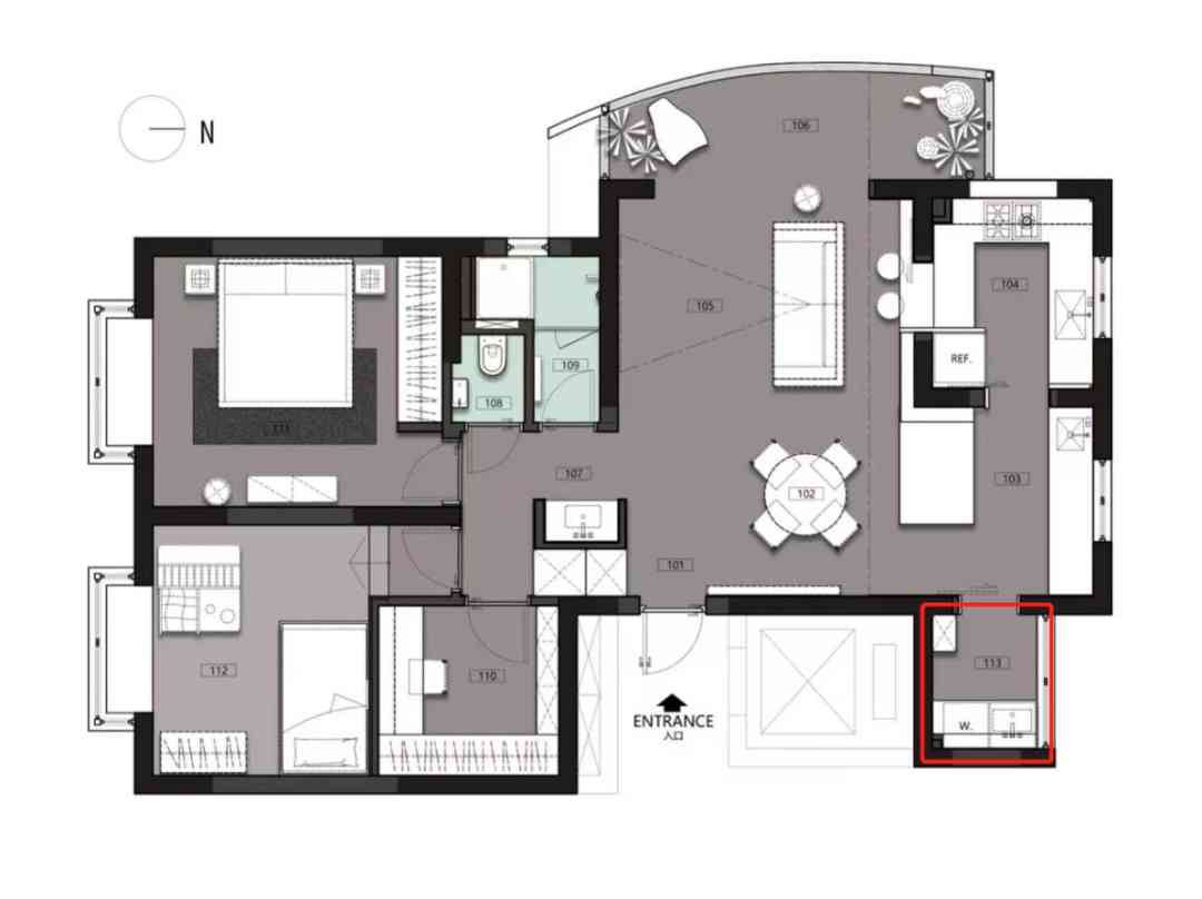 和餐区相连的北向阳台,经设计师重新布局,集合了洗衣、晾晒、清洁等家政功能,隐藏在推拉门后面,关上门整洁清爽。