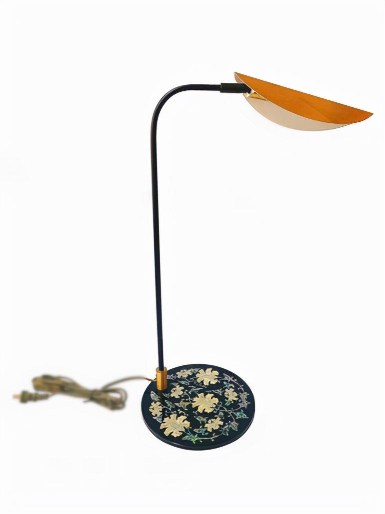 该作品底座采用金漆镶嵌的平磨螺钿工艺制作完成。台灯的现代感与螺钿的彩色光泽互相衬托、相得益彰。平磨螺钿技法材料名贵、色泽艳丽多彩。从诞生之日起就备受帝王公卿所青睐,堪称工艺珍宝。