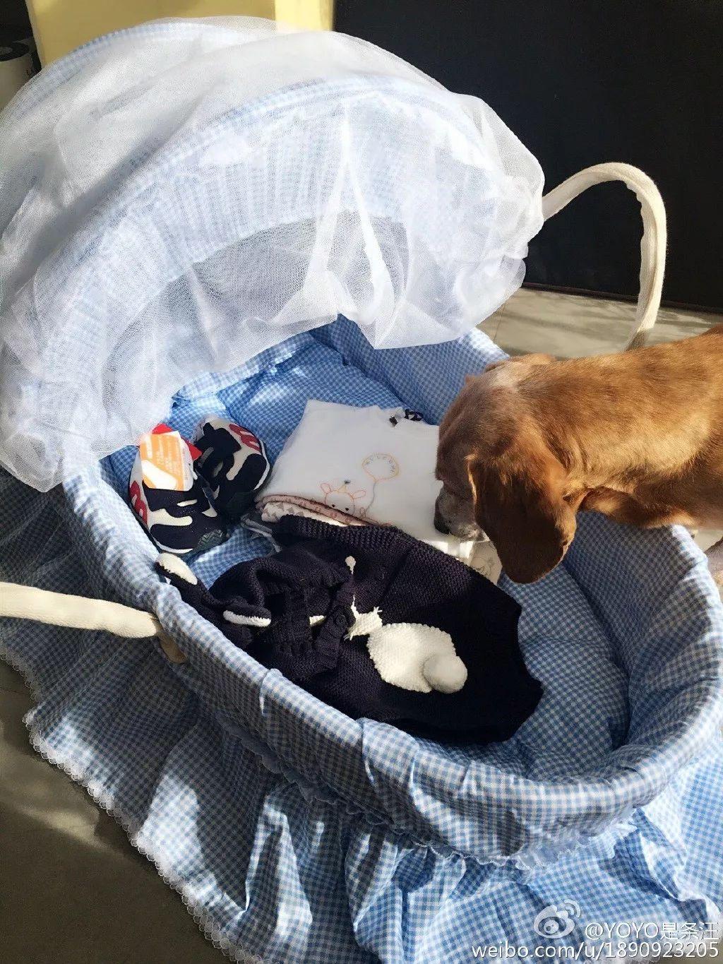 宝宝的婴儿推椅,宝宝的小鞋子,狗狗好奇的背影……这一切不就提前意味着张梓琳怀孕了嘛~
