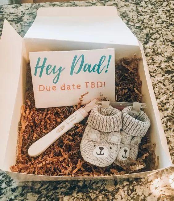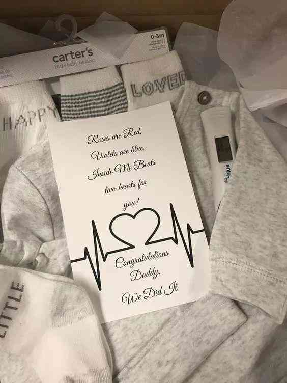 用宝宝的衣服包裹着验孕棒,并附上欢迎迎接新生命的贺卡。