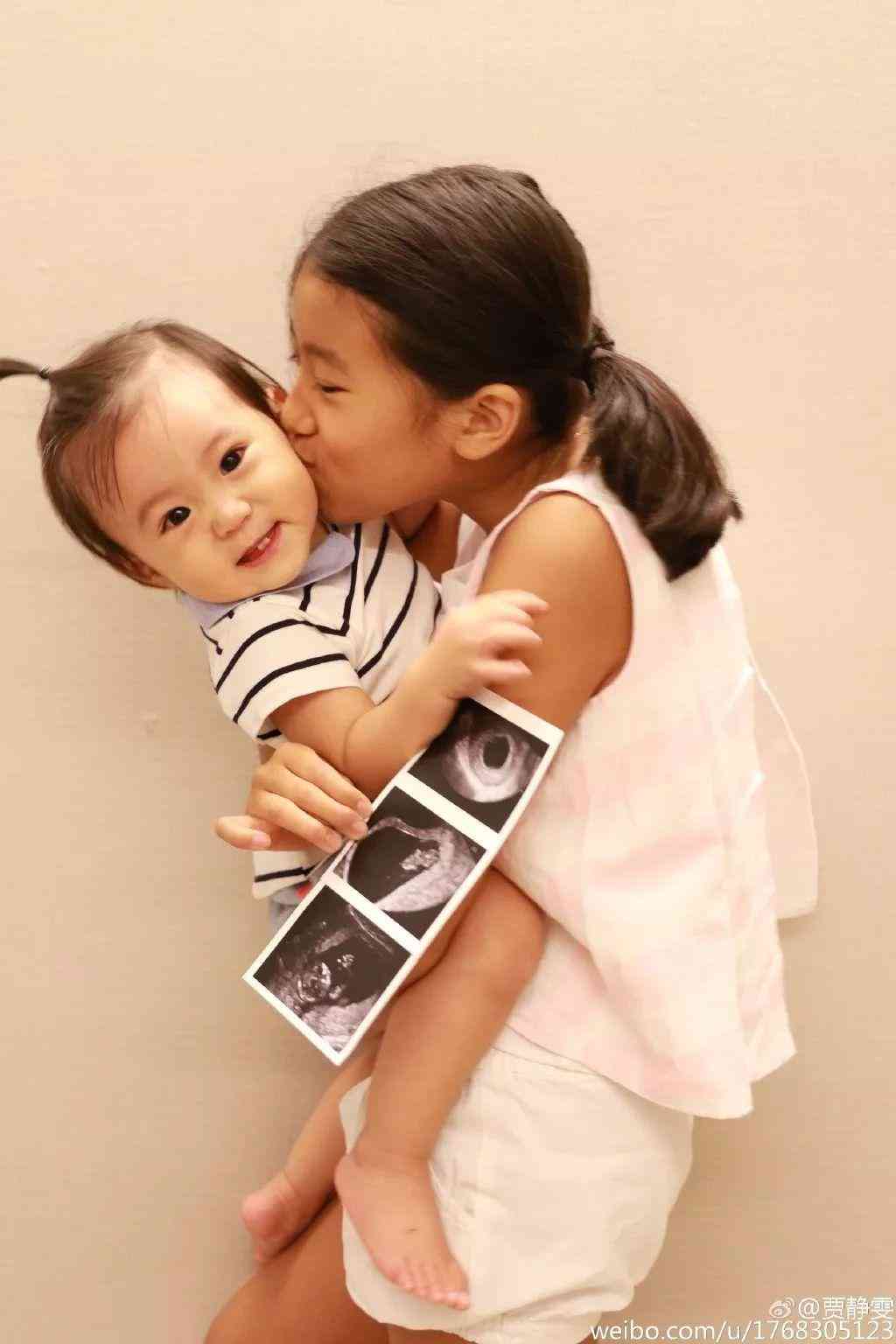 贾静雯当初官宣怀上咘咘的照片中,一张是梧桐妹站在妈妈的前方,亲吻她的肚子,另一张梧桐妹拿着“我是姐姐“的笑脸,超有爱的画面。