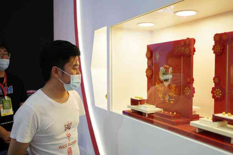 随着国潮风兴起,融合中华传统文化元素的珠宝商品站上了消费风口。一家主打“超微硬金”概念的深圳展商用时下较为流行的国潮风造型与黄金相融合,俘获了不少年轻消费者的眼球。他们为此次参展打造出了全新一代的“醒狮”系列摆件,手指头大小的舞狮摆件涂上几抹缤纷的珐琅彩,栩栩如生的设计让不少观众流连忘返,“我们的‘超微硬金’设计理念比较新颖,是国内首创,这让不少逛展商家对我们很感兴趣。”参展商向记者介绍道。