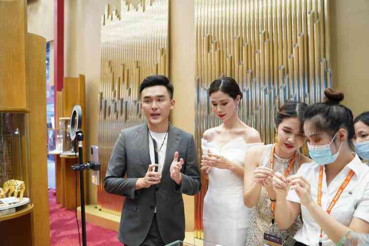 本次珠宝展的一大亮点是线上直播带货,除了深圳水贝抖音电商直播基地直播团队入驻本次深圳国际珠宝展,撬动直播流量出售自家商品也已成为各珠宝商家争相尝试的营销模式。参展的萃华金店负责人介绍:“虽然线下的营业额仍占绝大比例,但利用线上直播传播品牌形象也是我们非常重视的。”在萃华金店展位,叶上金蝉、龙凤富贵金碗等镇店之宝被主播“搬入”直播间,吸引了不少网友点赞留言。