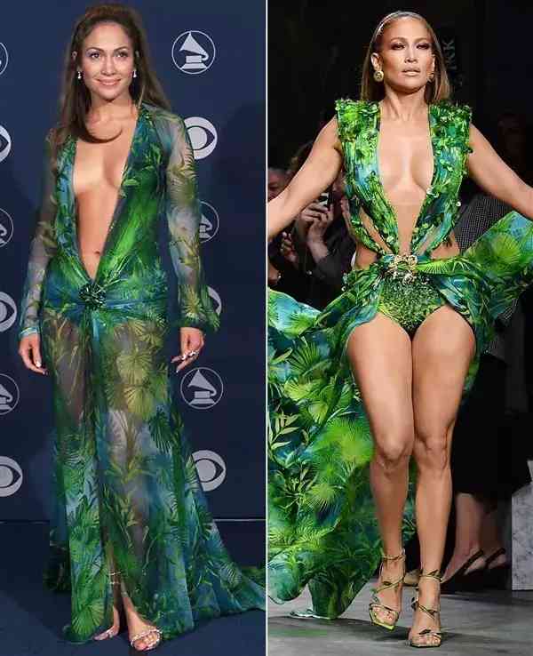 艺人走秀并不稀奇,但值得一提的是这一身衣服与她 2000 年格莱美的一身绿裙撞衫。