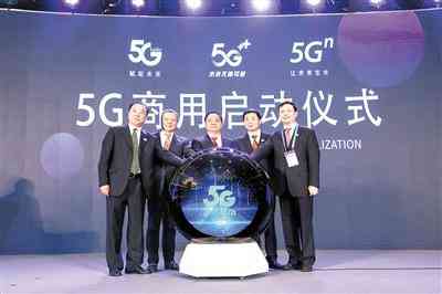 10月31日,在2019年中国国际信息通信展览会开幕式暨5G商用启动仪式上,中国铁塔董事长佟吉禄、中国联通董事长王晓初、工业和信息化部副部长陈肇雄、中国电信董事长柯瑞文、中国移动董事长杨杰(从左至右)共同参加5G商用启动仪式。当日,中国移动、中国电信、中国联通正式发布各自的5G套餐。新华社发