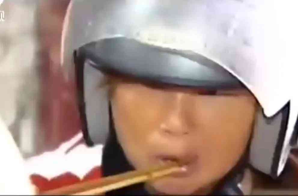 这不,这天中午孙俊文在家宴客,主与客共6人,个个不顾炎热戴着头盔吃饭,看起来既奇怪,又好笑。