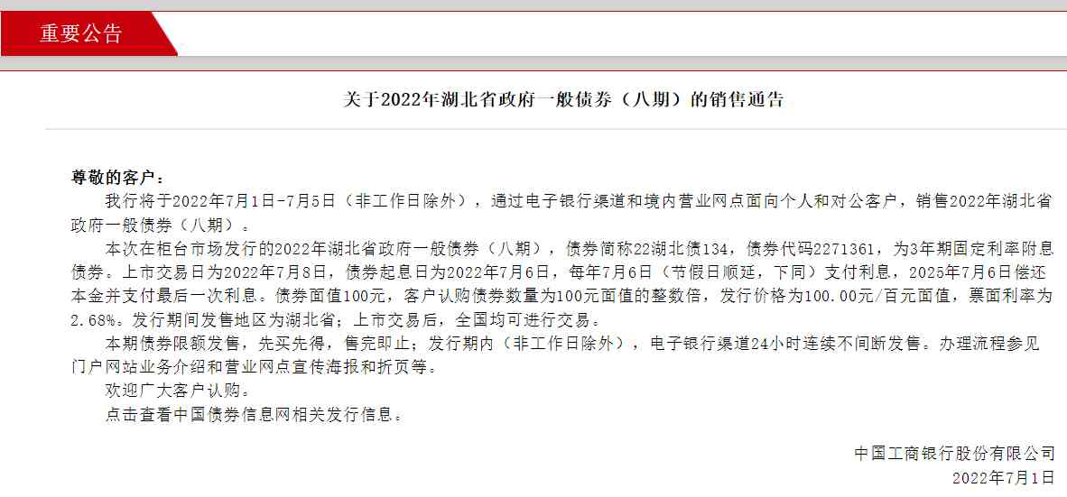 7月1日,中国工商银行发布公告称,我行将于2022年7月1日-7月5日(非工作日除外),通过电子银行渠道和境内营业网点面向个人和对公客户,销售2022年湖北省政府一般债券(八期)。