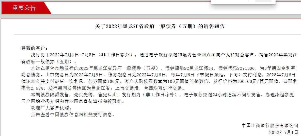 7月1日,中国工商银行发布公告称,我行将于2022年7月1日-7月5日(非工作日除外),通过电子银行渠道和境内营业网点面向个人和对公客户,销售2022年黑龙江省政府一般债券(五期)。