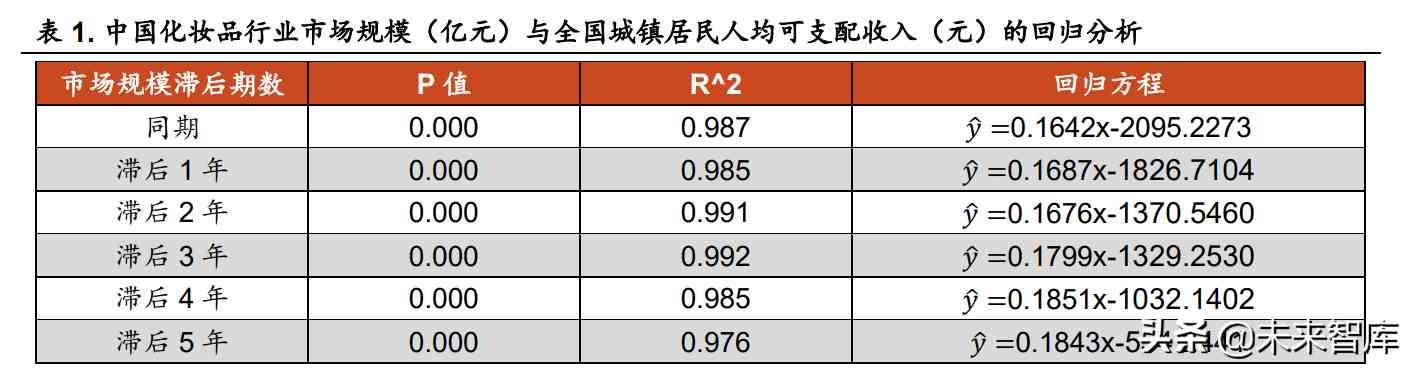 我们认为,化妆品行业规模提升的本质驱动力来源于全国城镇居民人均 可支配收入的提升,人均可支配收入的提升会带动化妆品人均消费额的提升。 我们对同期及滞后不同期限的中国化妆品行业市场规模与城镇居民人均可支 配收入进行回归分析,p 值均近似 0.000,小于 0.001,说明结果显著。可决 系数 R^2 均大于 0.97,说明回归关系可以解释因变量 97%以上的变异,拟 合优度较高。同期的回归方程为̂ =0.1642x-2095.2273,表明全国城镇居民 人均可支配收入每提高 100 元,将带来近 16.42 亿元化妆品市场规模的扩张。 为预测 2026 年化妆品行业的市场规模,我们将 2021 年的城镇居民可支配收入 47412 元代入回归方程̂ =0.1843x-554.2441 中,则预计 2026 年中国 化妆品市场规模约为 8184 亿元,与前文所述 Euromonitor 的预测较为 接近,均超过 8000 亿元的规模。