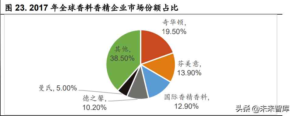 全球香料香精行业集中度较高,CR5 占比超 60%。全球 CR10 的销售额 占比由 1999 年的 64.60%提升至 2017 年的 77.20%,行业集中度稳中有升。 其中,全球前五大香料香精企业主要为欧美厂家,包括奇华顿、芬美意、国 际香料香精、德之馨、曼氏,2017 年市占率分别为 19.5%、13.9%、12.9%、 10.2%、5%,合计 61.5%。中国本土香料香精企业以中小企业为主,2019 年 我国共有香料香精企业 1000 余家,年销售额过亿的仅 30 余家,占比较低。