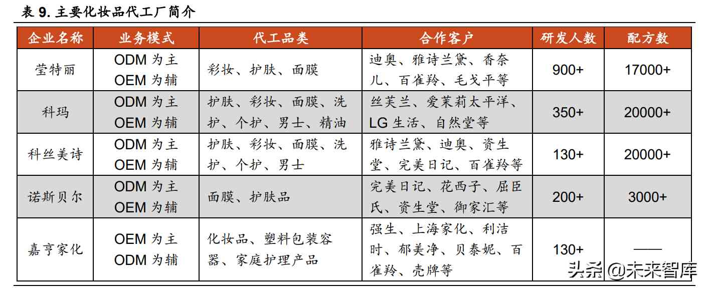 品牌商生产化妆品有自产和代工两种方式。资金实力雄厚的成熟品牌出 于配方保护、品控和规模效应的考量,多以自主生产为主、委托加工为辅, 对代工的需求主要集中于非核心品类、迭代周期较短的彩妆、以及大促期间 的产能补充。新锐品牌通常集中资源用于营销,在制造端布局较少,通常会 选择代工完成产品生产。 化妆品代工行业发展较为成熟,全球前三的代工厂商包括韩国的科丝美 诗(Cosmax)、意大利的莹特丽(Intercos Group) 和韩国科玛(Korea Kolmar) 等。国内上市的化妆品代工厂商主要有嘉亨家化和青松股份(本土头部代工 企业诺斯贝尔为其子公司)。代工的模式主要分为 OEM 和 ODM,OEM 即贴 牌生产,公司按照客户提供的配方设计、工艺控制要求进行生产,生产技术 为核心竞争力,ODM 即自主设计制造,公司根据客户需求开发产品,产品研 发、配方设计、工艺控制等主要由公司完成,研发能力为核心竞争力。目前 莹特丽、科玛、科丝美诗、诺斯贝尔以 ODM 模式为主,嘉亨家化以 OEM 模 式为主。