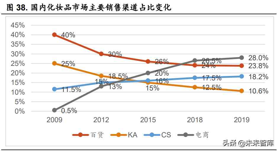 我国化妆品市场经历了几轮渠道更迭,大致可分为以下几个阶段: (1)百货及 KA 时代(2000-2009 年):KA 渠道指沃尔玛、大润发等大 型商超,产品主要覆盖日化用品及大众美妆产品。百货渠道品牌档次高于 KA, 注重消费者体验,是海外大牌在国内的线下主战场。 (2)CS 渠道红利(2009-2015 年):CS 为屈臣氏、丝芙兰、娇兰佳人 等化妆品专营店,通常为多品牌加盟代理经营。通过布局下沉市场,自然堂、 珀莱雅、韩束、百雀羚等本土品牌随着 CS 渠道的发展而快速崛起。 (3)传统电商红利(2015-2018 年):电商渠道增长迅速并成为大 渠道,淘宝、天猫等等传统电商平台兴起。线上渠道进入壁垒低,面膜、精 油等品类与电商渠道契合度高,孵化出了阿芙精油、御泥坊、膜法世家等受 益于电商红利的“淘品牌”。珀莱雅在该阶段也积极抓住线上化趋势进行布局, 销售额实现快速增长。 (4)社交电商红利(2018 年至今):社交电商兴起,出现了完美日记、 花西子、橘朵等新锐品牌。