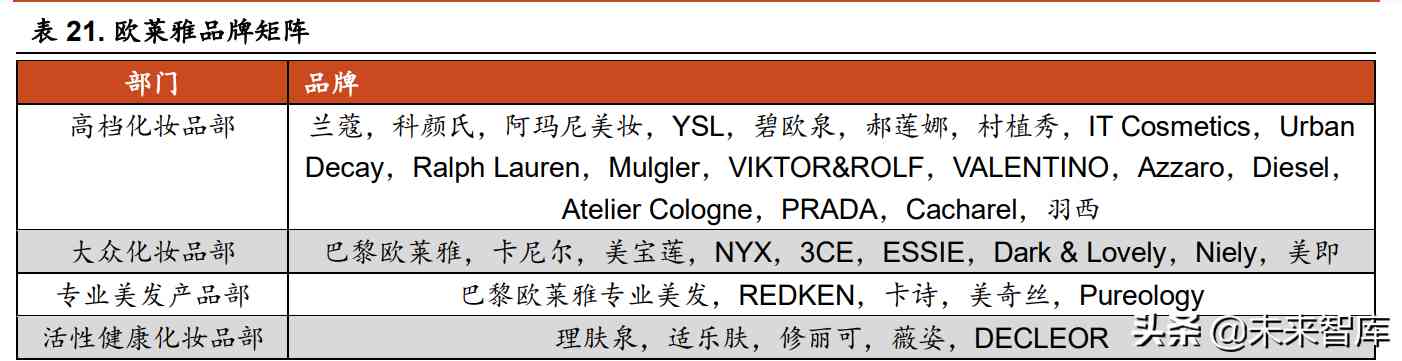 雅诗兰黛和欧莱雅的品牌矩阵具有以下特征:1)多品类发展。产品品类 齐全,护肤、彩妆、香水、护发品类均有覆盖。2)品牌定位完善。高端(La Mer,雅诗兰黛;郝莲娜、兰蔻等)、大众(MAC、Too Faced;巴黎欧莱雅、 美宝莲等)、小众细分市场(Aerin、La Labo 等)均有覆盖。