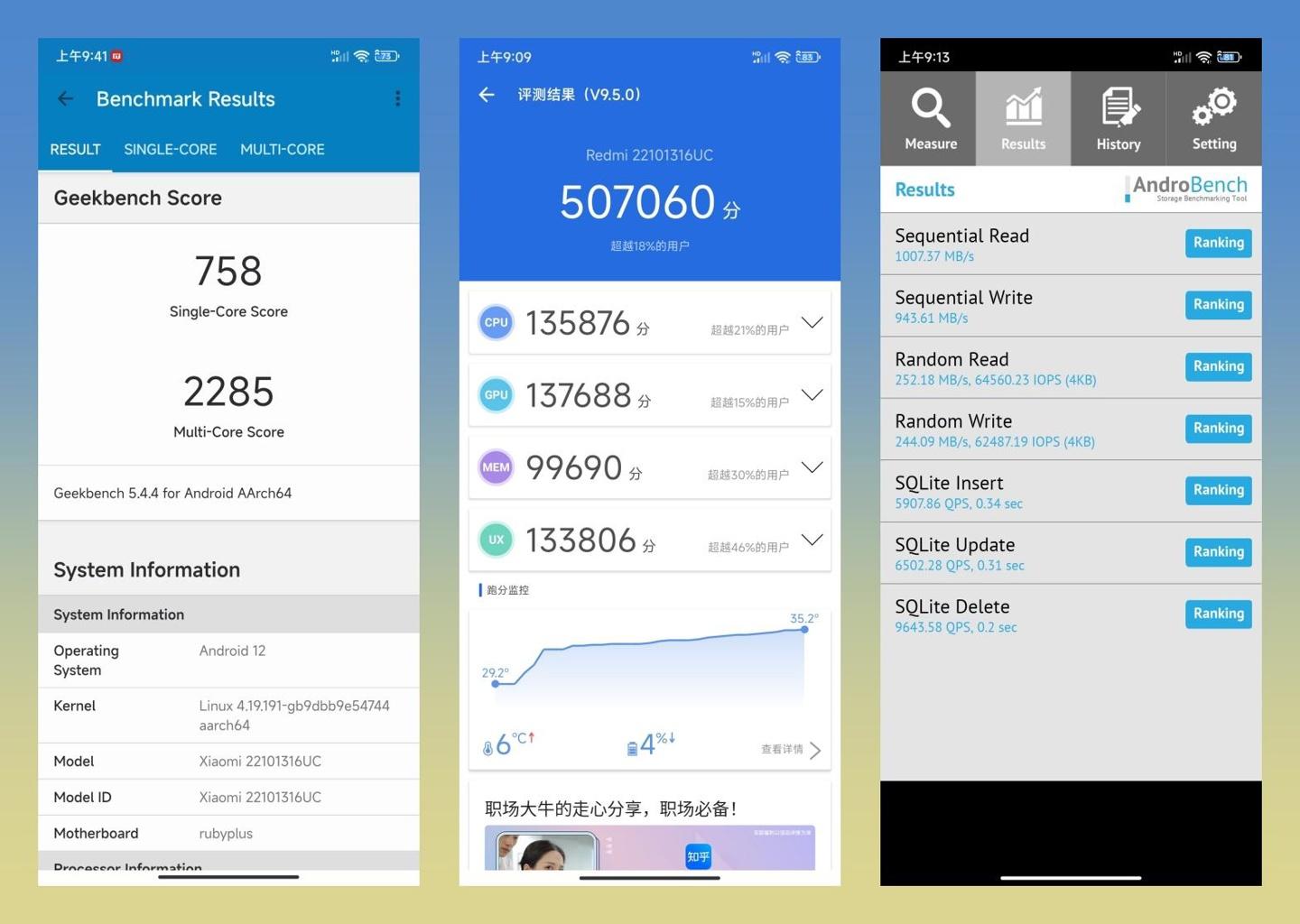 在测试中,我们开启了 Redmi Note 12 探索版的高性能模式,通过安兔兔、Geekbench5 以及 Androbench 进行测试: