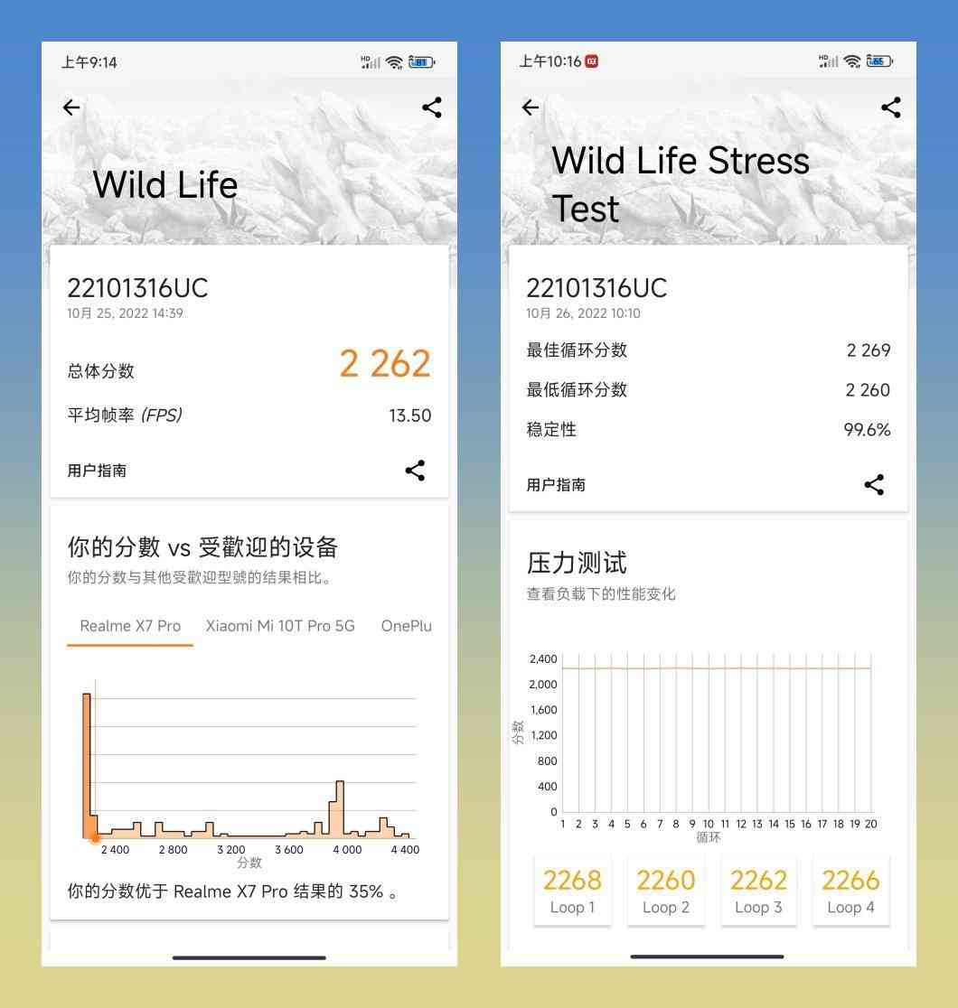在 3DMark 中的 Wild Life Stress Test 项目中,Redmi Note 12 探索版获得了高达 99.6% 的稳定性,从测试图来看,Redmi Note 12 探索版在 20 轮的测试中表现始终保持稳定状态,这也代表着性能释放比较稳定。此外,在 Wild Life 测试中,Redmi Note 12 探索版获得了 2262 的整体分数,帧率为 13.50。