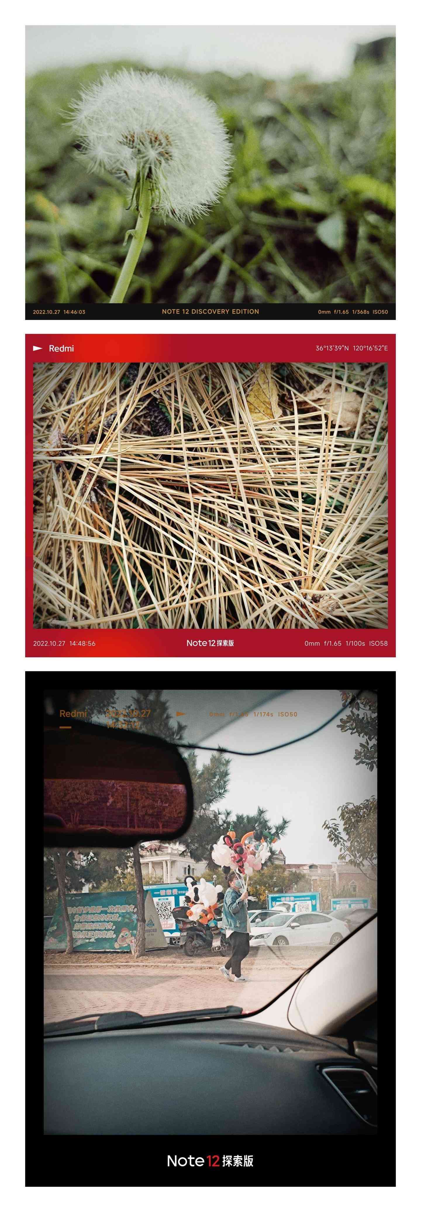 这一次,Redmi Note 12 探索版全球首发三星「HPX」旗舰大底主摄,并且拥有全链路的影像升级,包括光圈提升到 f / 1.65,大幅提升进光量;同时,升级 7P 的旗舰级结构,成像更清晰;最终,高端 ALD 抗眩光镀膜,极大提升画质纯净度。此外,这颗主摄还带有光学防抖。