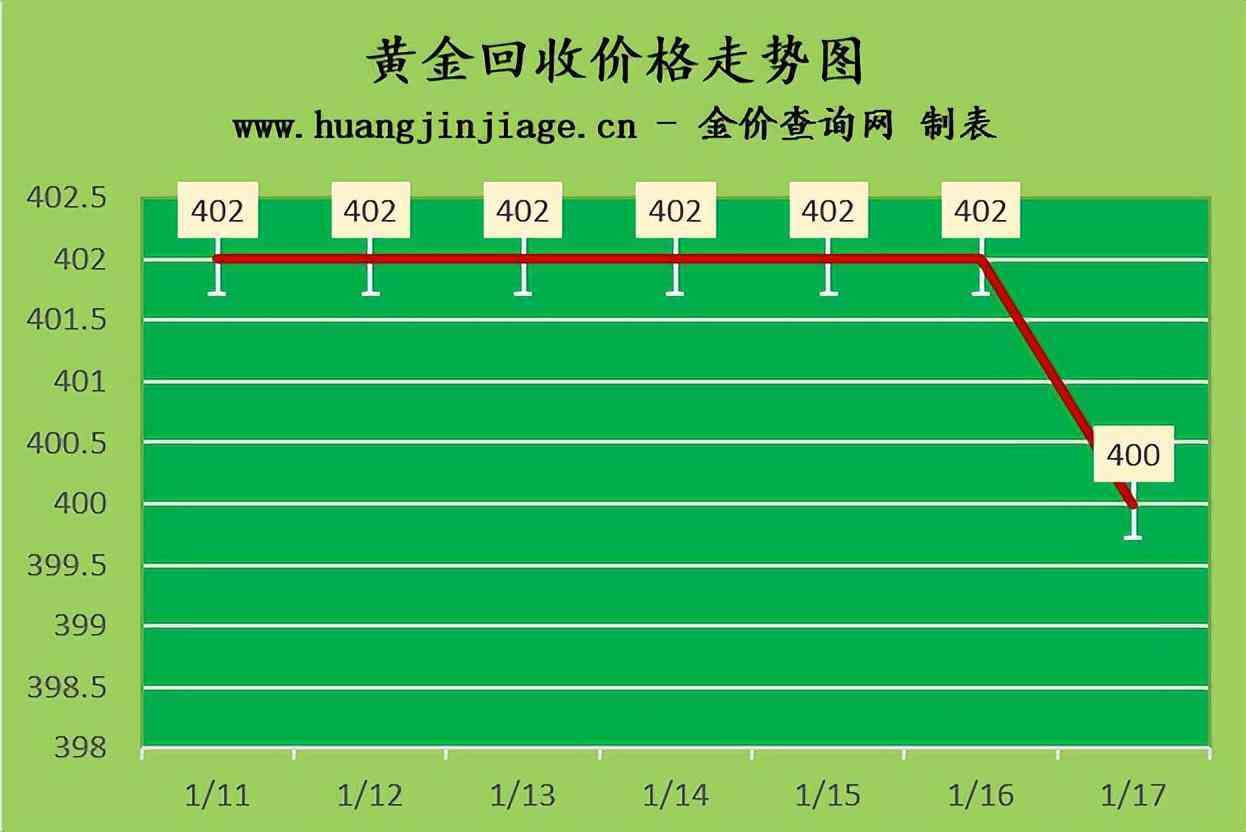 黄金回收价格400元/克,铂金回收价格198元/克,钯金回收价格340元/克,18K金回收价格296元/克,银条回收价格3.8元/克。(黄金行情是波动的,回收金价没有固定标准。)