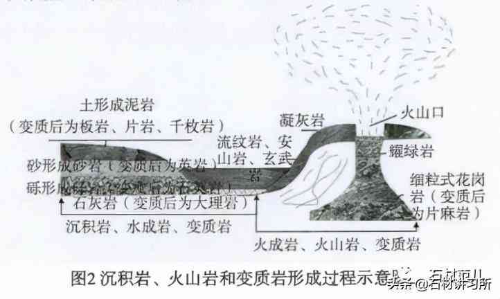 天然岩石在自然界极为丰富,其形成见图2。据初步统计,已达2000余种。矿物的种类有硅酸盐、碳酸盐矿物、硫酸盐矿物、氧化物、氢氧化物、卤化物、有机矿物、硼酸盐、硝酸盐、神酸盐、磷酸盐、饥酸盐、铭酸盐、鸨酸盐、钥酸盐等。
