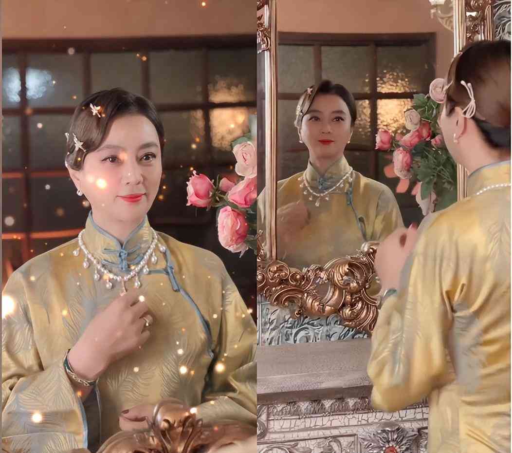 戴好首饰的李玲玉对着镜子看自己的造型, 还时不时得整理自己的衣服。头上都是戴的珍珠发卡,涂着大红唇气色极好。一颦一笑之间,那气质绝佳。一旁的粉色玫瑰,衬得她容貌更加的出众,一点也看不出年纪。