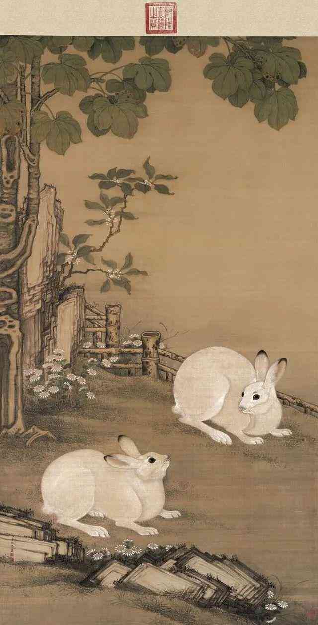 这幅画我相信是特意为这次兔年春节安排的。兔和花草都带有郎世宁影响的写实风格,石头则夸张方折,极具特色。