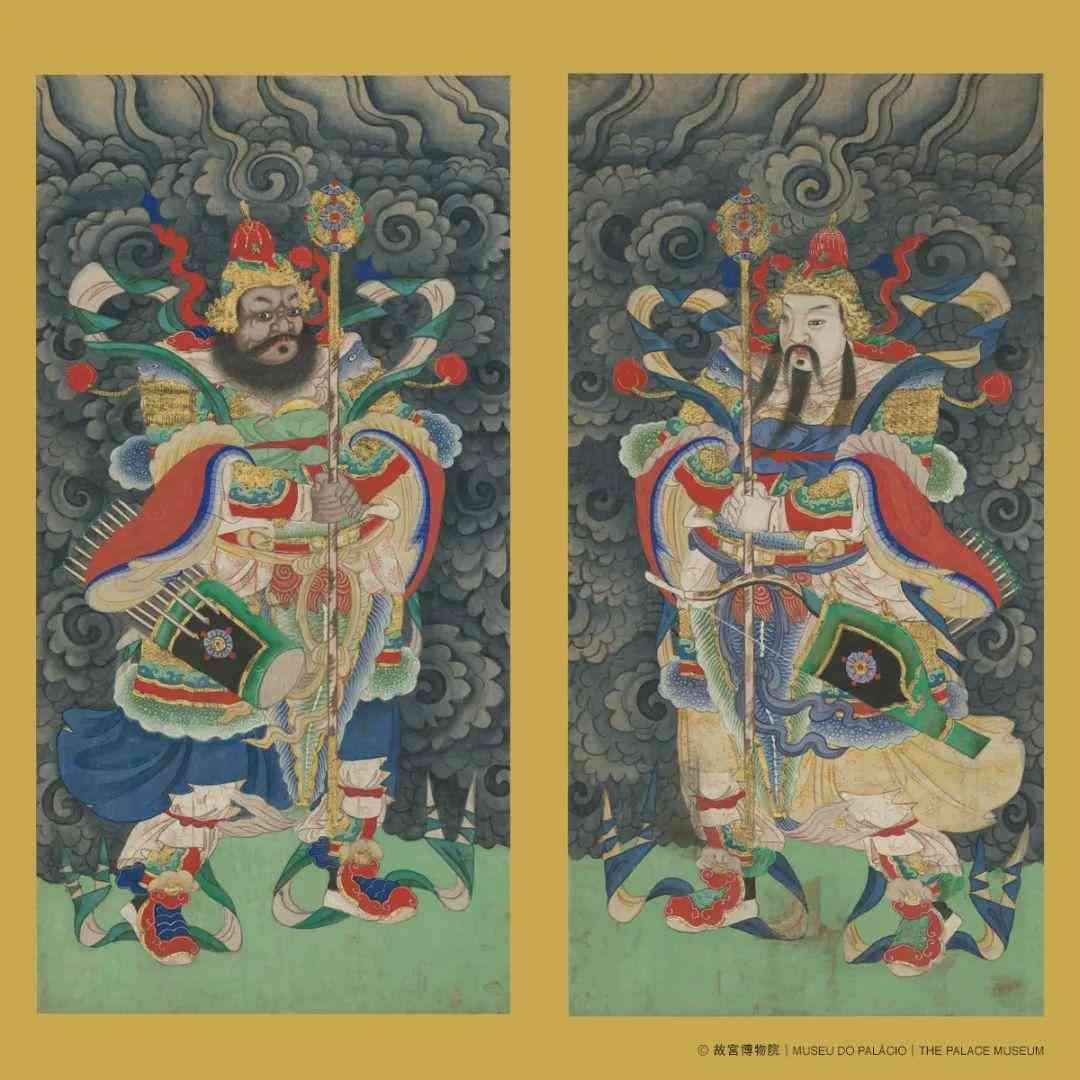 布面泥金贴落,一般也只有宫廷的门神才会用沥粉贴金、描金这些工艺。所绘应为秦琼和尉迟恭。