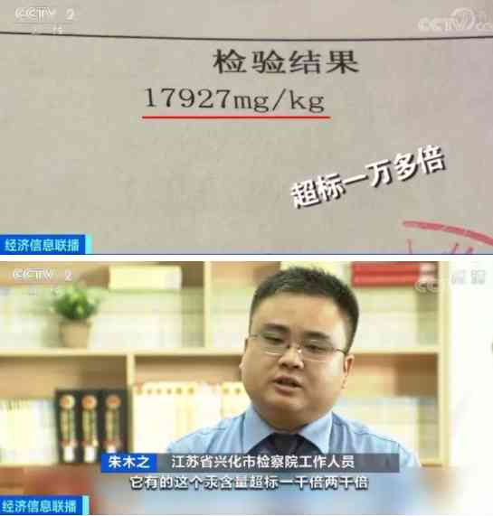 江苏省兴化市检察院工作人员 朱木之:从我们检测的结果来看,它有的这个汞含量超标一千倍两千倍,有的甚至超标上万倍。