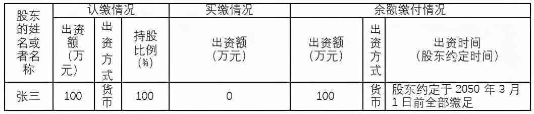 如章程约定下图:则股东张三的认缴出资额为100万,认缴出资时间为:2050年3月1日,认缴出资方式为:货币。实缴出资额为0万元。