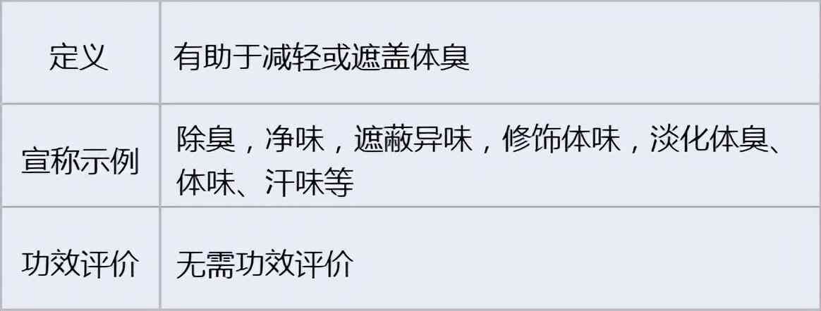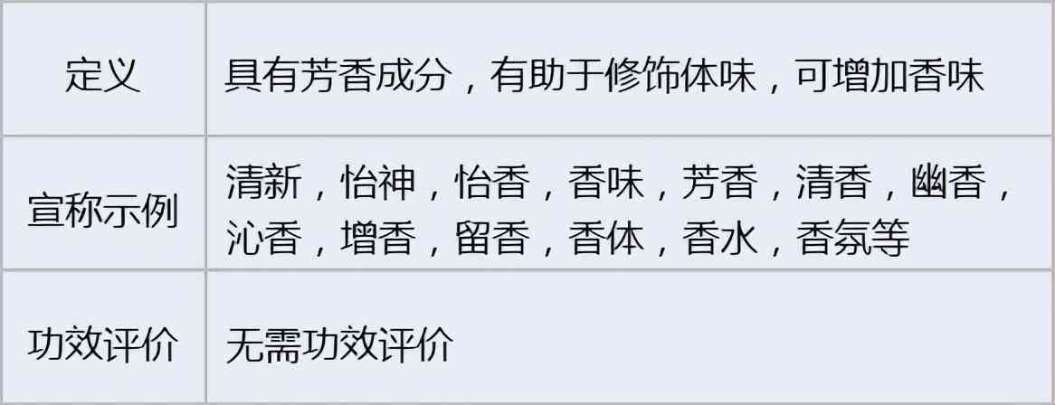 芳香仅指增加香味的产品,宣称减轻或遮蔽体臭、异味的归为除臭类化妆品。