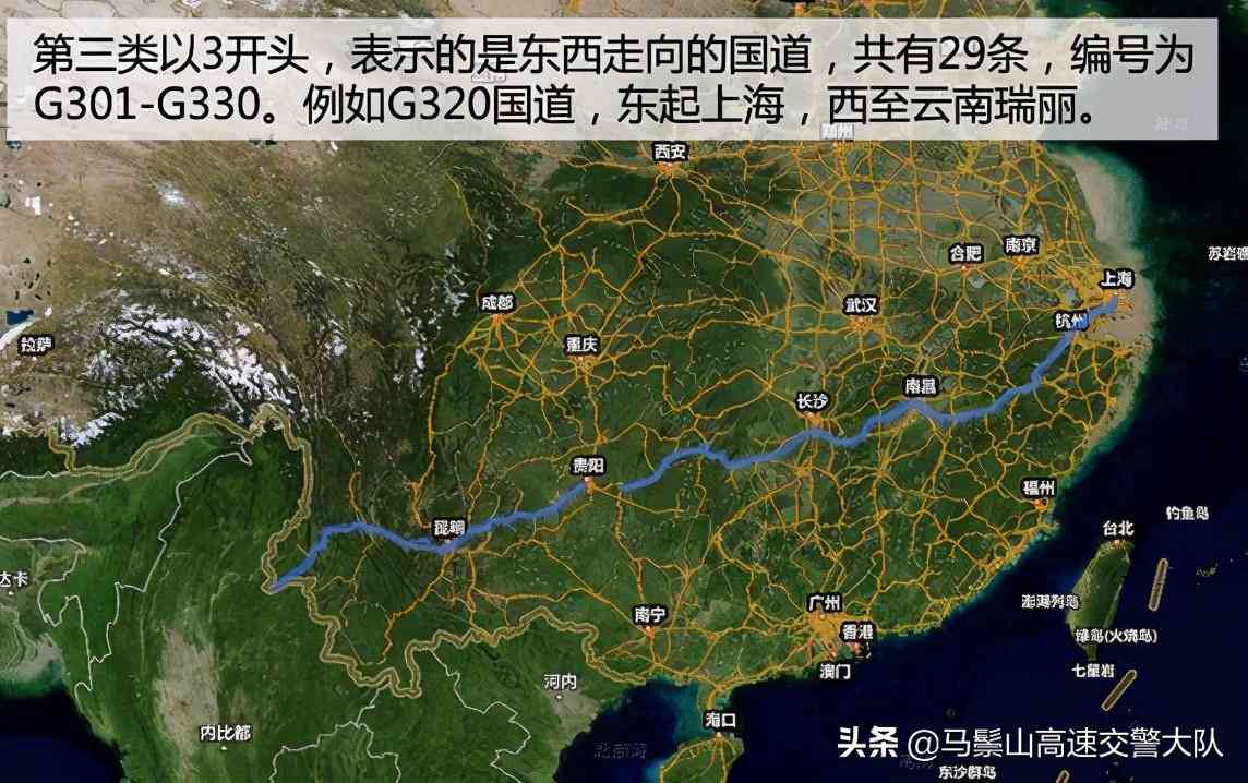国道是连接各个不同省市之间的重要交通枢纽,有跨越好几个省市、总长超过几千公里的国道,也有仅连接几个城市、仅有几百公里的国道。一般国道编号为:字母G+3位阿拉伯数字,例如:GXXX,在交流过程中我们一般只取后面的三位数字,比如:G318念作318国道。