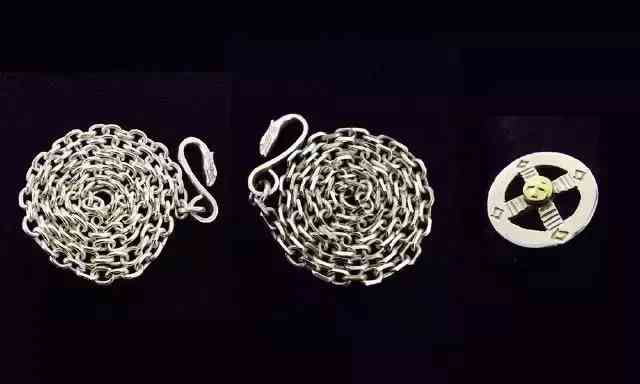 丸链 / 角链 / 点金飞轮链子分成角链和丸链,角链是起菱角的;丸链是圆身的。尺寸分成细和大。在炒卖市场,细角链的价格相对比较高。