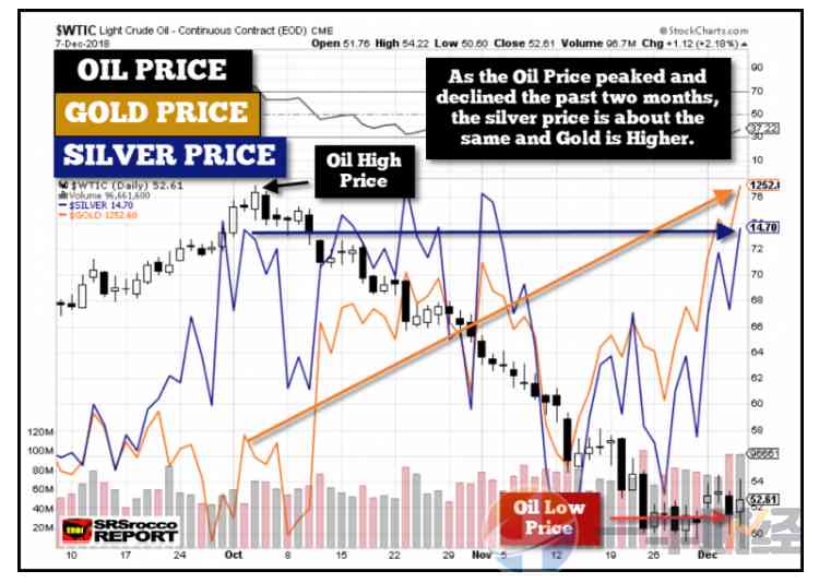 如上图所示,虽然油价在10月初达到每桶77美元的峰值,同期的白银价格大致也相同,不过,黄金价格则上涨了40美元。而且即使黄金和白银价格自12月3日以来猛涨,石油价格实际上仍然较低。