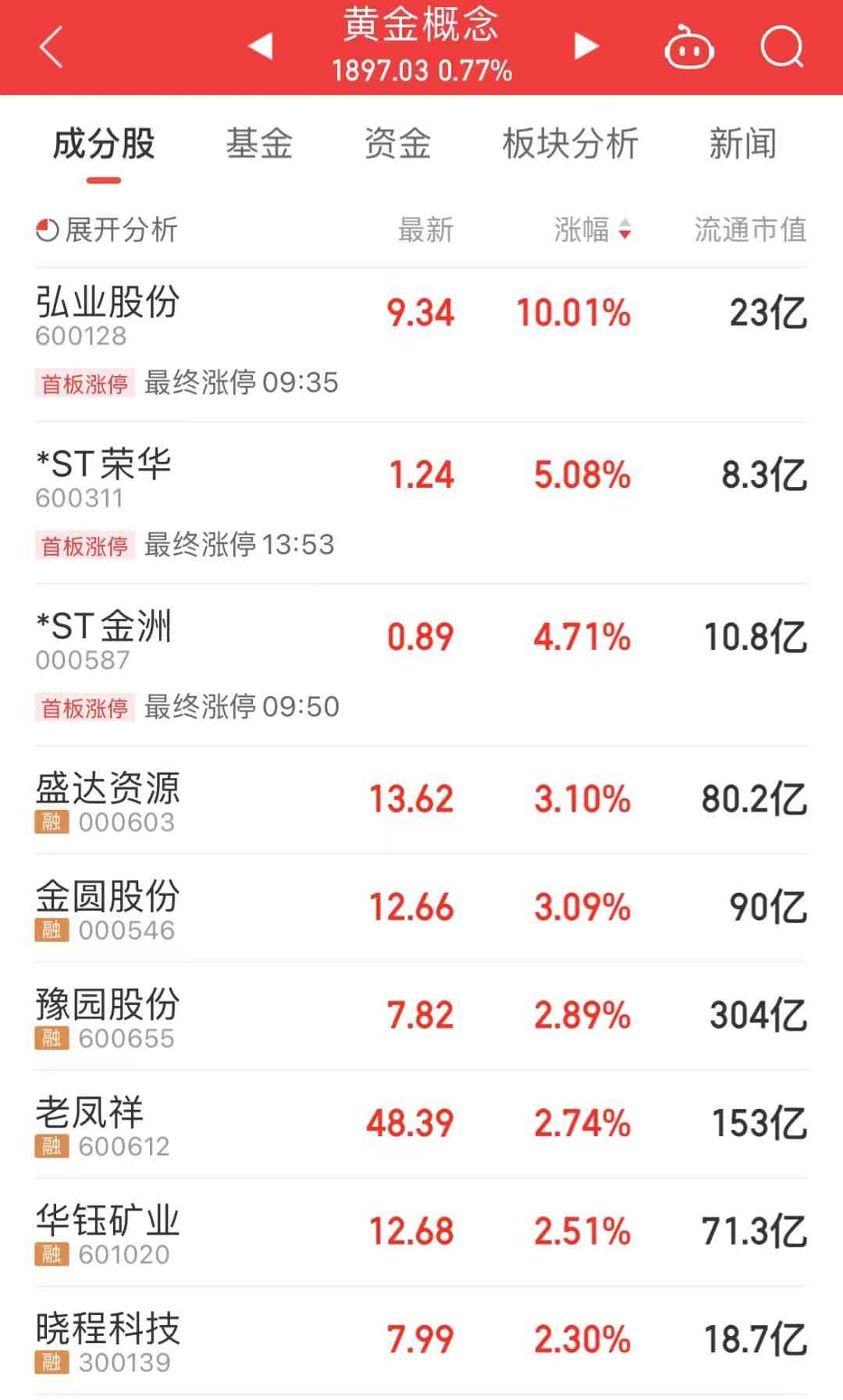 长线来看,今年年初以来,超九成概念股实现上涨,平均涨幅达到5.56%;5只概念股累计涨幅超过10%,包括紫金矿业、*ST荣华、老凤祥、潮宏基、周大生。