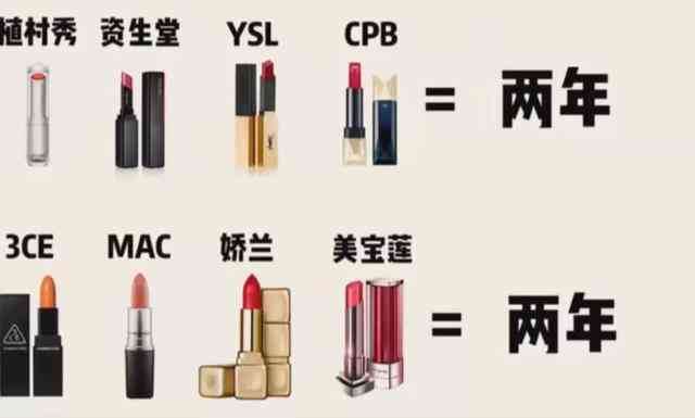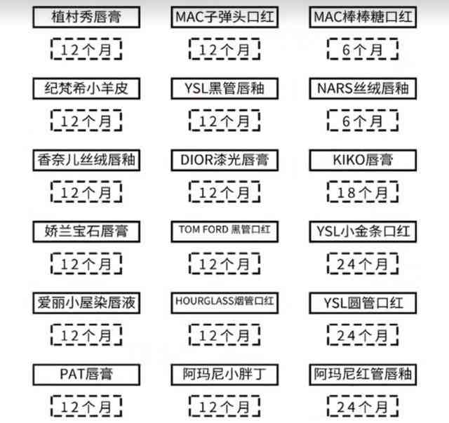 一般大家比较常用的口红品牌,它们的保质期也是不同的。MAC的棒棒糖口红和NARS的丝绒唇釉保质期较短为六个月。MAC的子弹头系列,纪梵希的小羊皮系列,YSL黑管唇釉,香奈儿丝绒唇釉,迪奥漆光唇膏和阿玛尼小胖丁都是属于12个月的保质期。