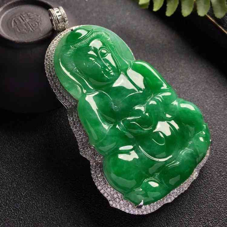 糯冰种正阳绿镶白金钻石观音胸坠