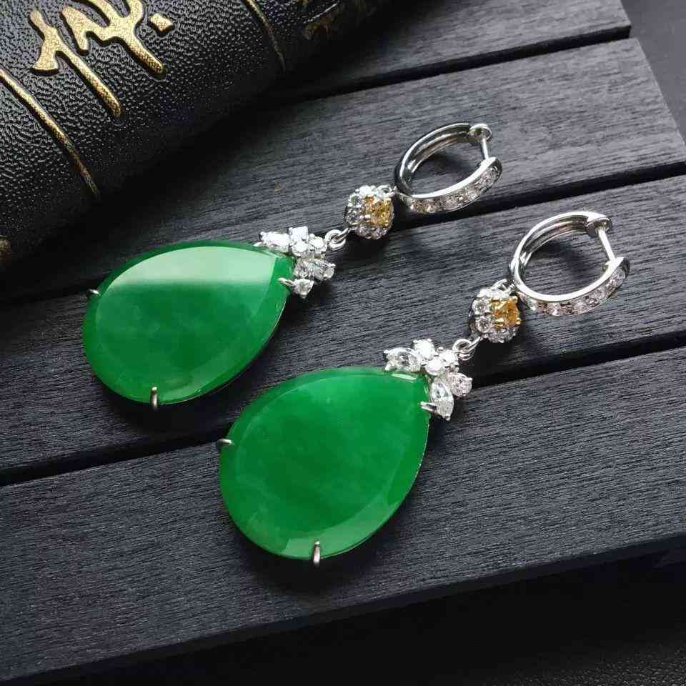 糯冰种翠色镶白金钻石水滴耳坠