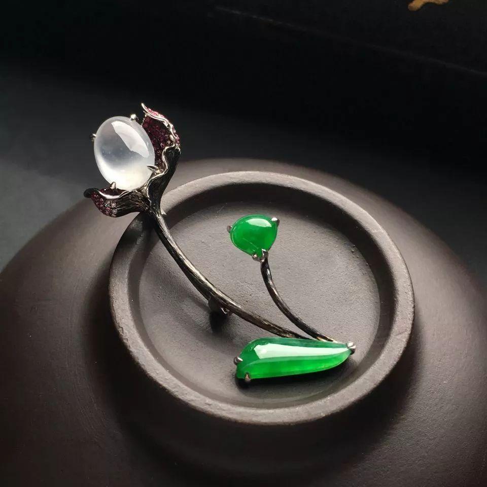 镶乌金冰玻种无色/糯冰种阳绿一枝独秀胸针