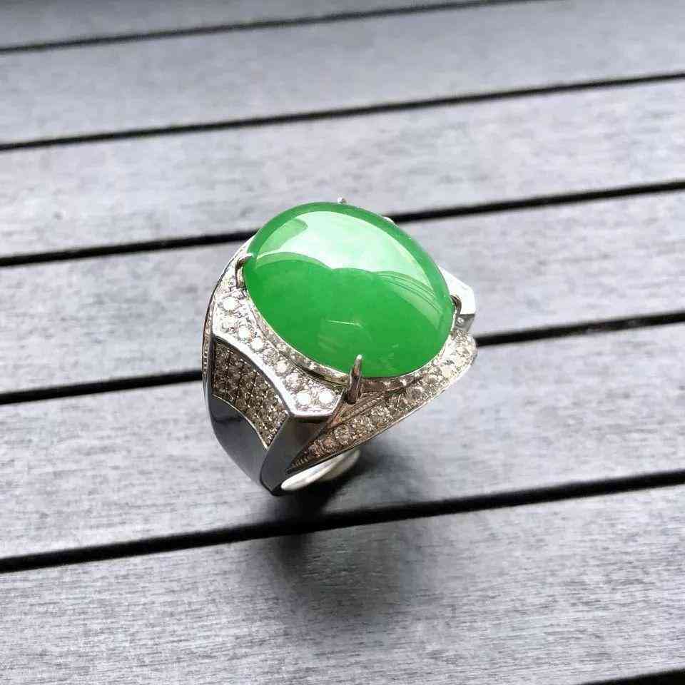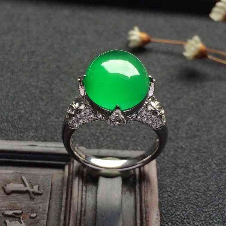 镶白金钻石糯冰种阳绿戒指