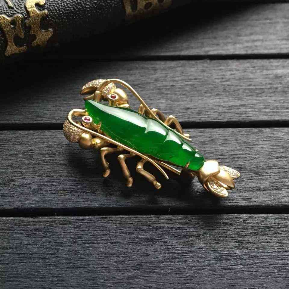 冰种正阳绿镶黄18k金钻石玉虾胸针/胸坠