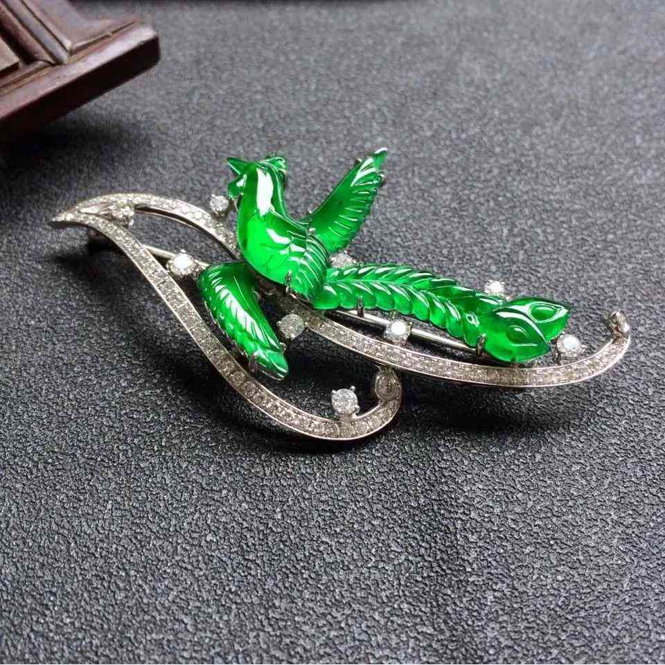 镶白18K金钻石冰种阳绿凤凰胸针
