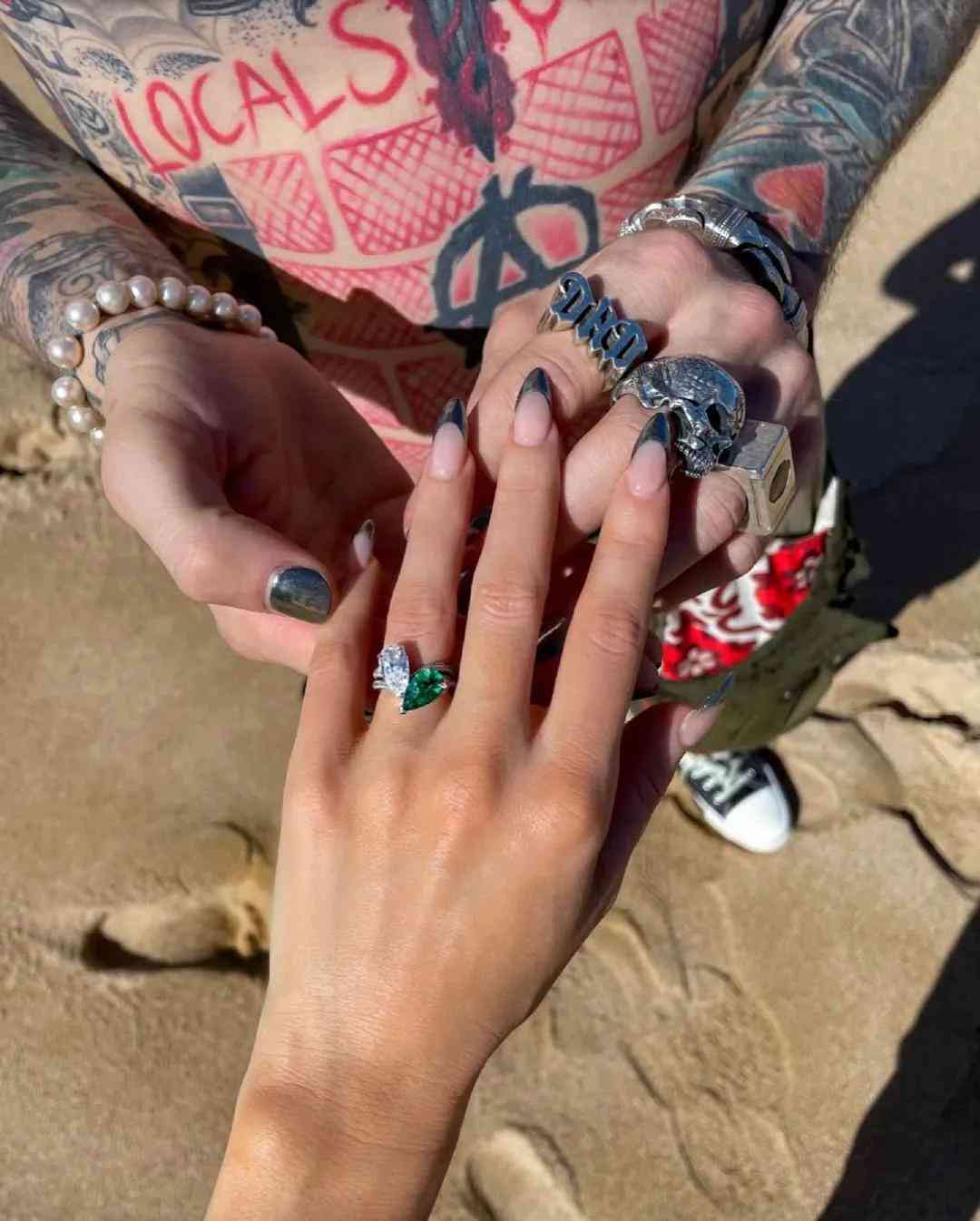 梅根•福克斯 Megan Fox 自从和枪哥Machine Gun Kelly恋爱后,这对儿情侣就经常到处撒狗粮秀爱情。最近枪哥更是向梅根求婚成功,订婚戒指镶嵌了一颗硕大的哥伦比亚祖母绿宝石,让不少网友甚是羡慕,尤其是一些女孩子。令人意想不到的是,这婚戒一旦戴上就很难摘下来,除非暴击拆除。