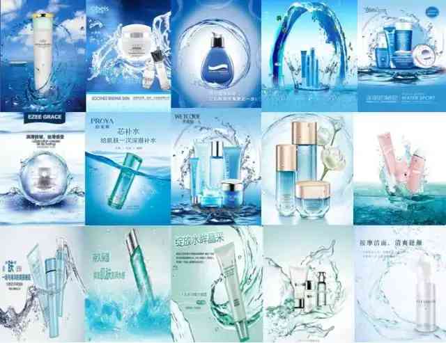 作为护肤品类的基本功效,补水、保湿几乎是护肤品牌的标配,在海报中加点水,衬托、环绕……是基本的“用水”规律。