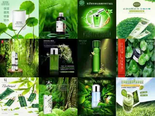 这些绿意盎然的化妆品海报,想突出的是:“我”添加了大自然里的植物成分,“我”天然、“我”安全。