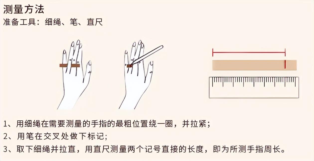 先确定好戴戒指用哪根手指,用细细的线或者绳子绕手指一周,绳子缠绕不宜过紧或者过松,恰好贴合皮肤即可,然后用笔在绳子交叉的地方做个记号,再取下绳子测量记号之间的长度,这就是这根手指的指围。