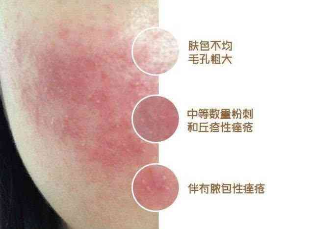 【激素性皮炎】发病时会感觉瘙痒、灼热、疼痛、干燥、脱屑、紧绷感。面部皮肤出现潮红,反复发生红斑、丘疹、皮肤萎缩变薄、毛细血管扩张,痤疮泛发,酒渣鼻样改变,停用激素治疗后皮损反复或加重,再次使用后症状缓解。